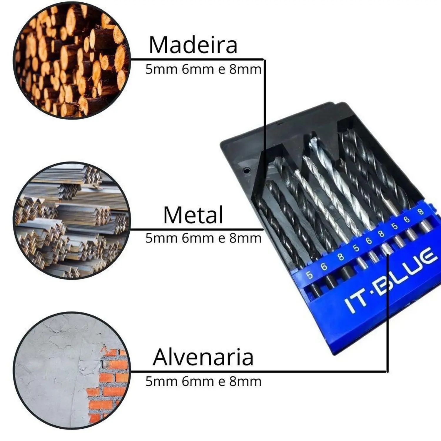 Jogo de Broca 5, 6 e 8 Ferro, Madeira, Alvenaria e Metal It-b